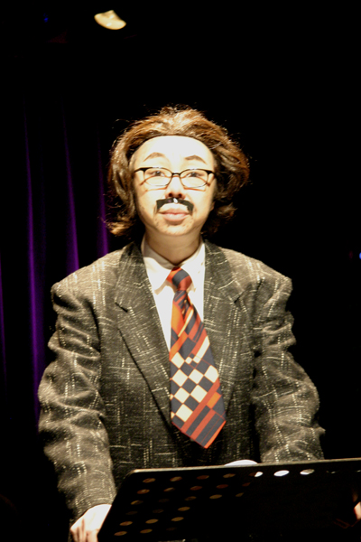 稽古場での彼は、ひょうひょうとしていて、どこを押すと何が出てくるのか予測不能な感じの不思議な面白さを持っている人です。その面白さ、奥ゆかしさに魅かれて彼にも毎回出演をお願いしてしまいます。今回も……炸裂しています。(笑)
