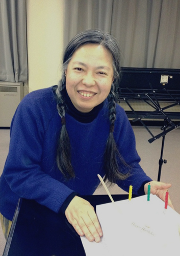 譜面台や小道具のセッティングをしていたら、いきなり部屋の明かりが消えて、「何? どうしたの?」と思っていたらなんと……ろうそくの灯ったかわいいケーキが登場!!! そしてHappy Birthdayの歌……