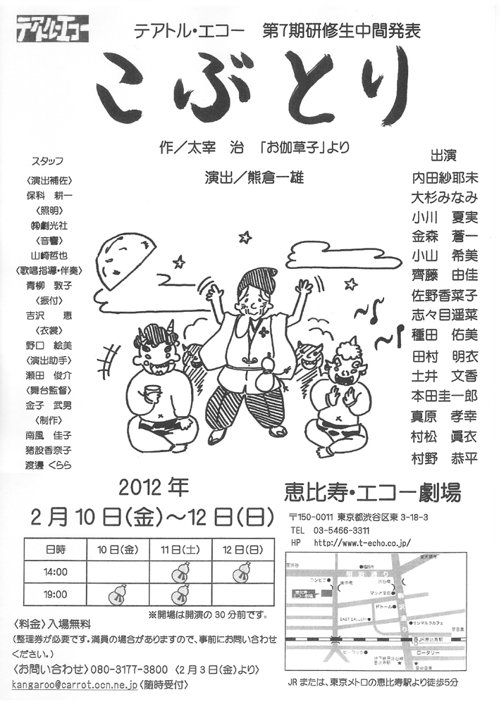 本日は、テアトル・エコー第7期研修生中間発表公演『こぶとり』の千穐楽です。