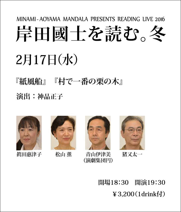 そうそう、その神品さんは明日、2月17日(水)南青山マンダラで「岸田國士を読む。2016冬」に登場します。演目は『紙風船』と『村で一番の栗の木』の2本。